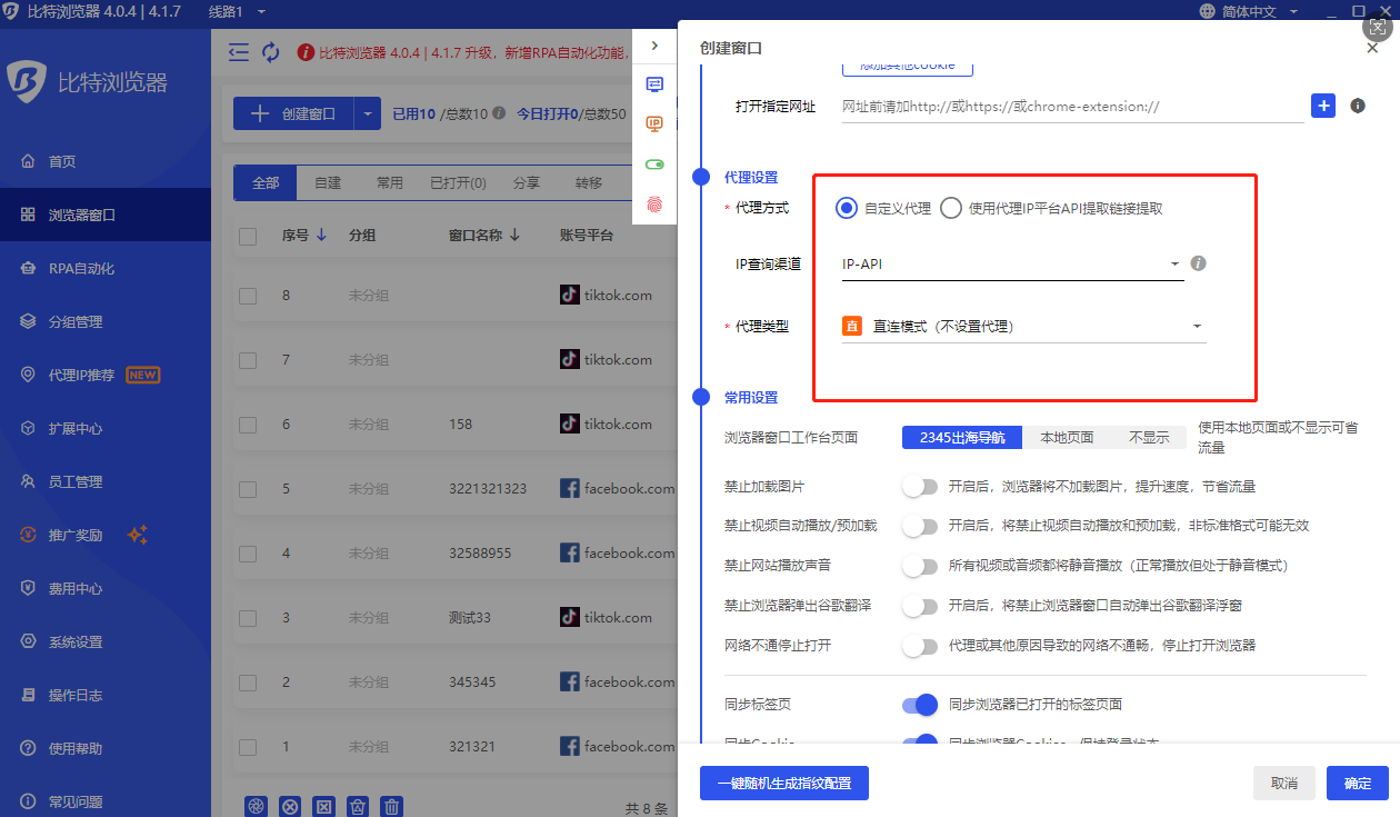 使用比特浏览器的方法,比特指纹浏览器支持10个环境免费(10个窗口的搭建和打开),需要搭载静态/动态住宅IP到窗口里设置,本地环境开始全局等模式。生成指纹后才能正常操作。如果不设置代理,使用的就是本地代理。10个窗口不够使用需要购买会员套餐使用。