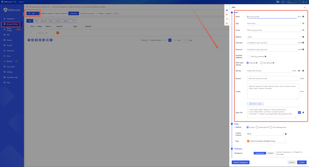 New Window: [Browser Profiles] – [Add], a detailed information page as shown below will appear. Fill in the information in the [Basic ] section.