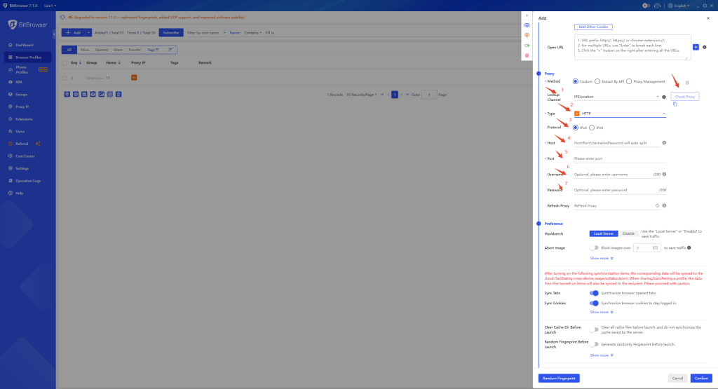 Configure proxy: Locate the [Proxy] module, select “Custom Proxy” for the [Proxy Method], choose “HTTP, HTTPS, or Socks5” for the [Proxy Type], then fill in the proxy information of 1024proxy in the corresponding fields, click [Proxy Detection] to test the connectivity of the proxy, confirm that it is correct, and then click [Confirm] to complete the creation of the browser window.