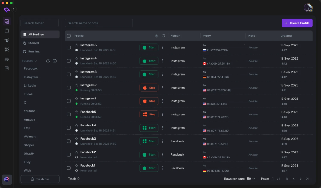 Enter a name, select the platform type (e.g., Facebook, Amazon, TikTok), and configure fingerprint parameters. Each profile generates a unique browser environment.